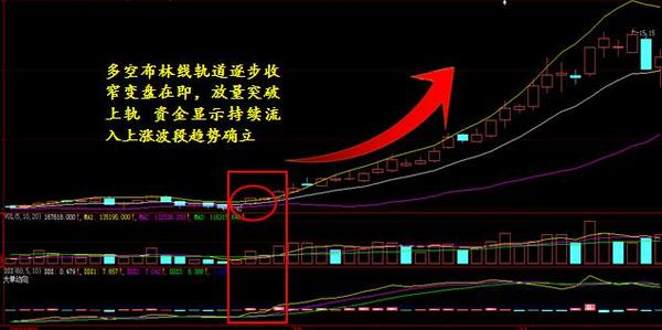 第四:爆發前BOLL三線粘合越緊密,后市爆發幅度越劇烈。